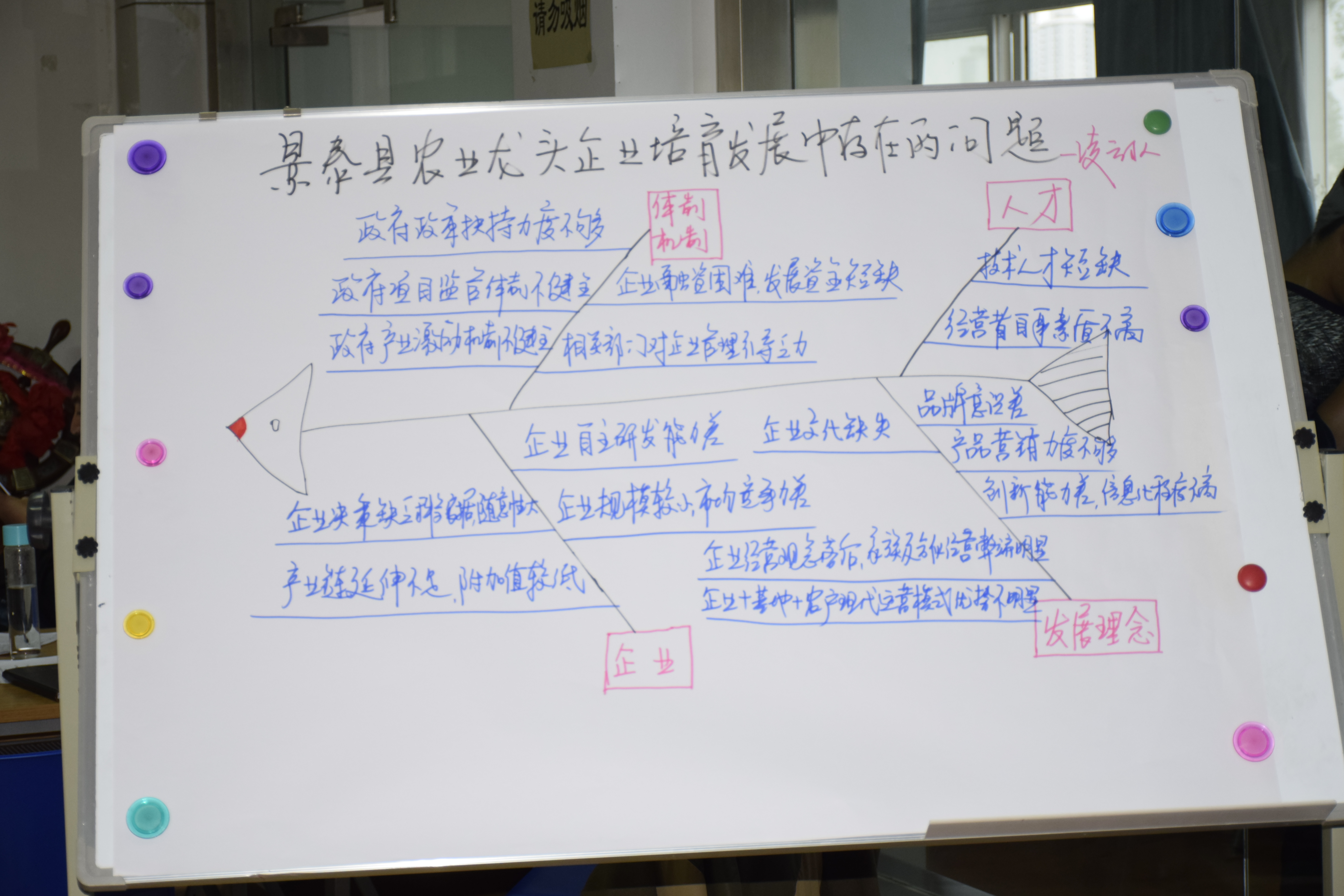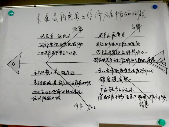 一是确定研讨主题。按照目前景泰县的发展现状,结合培训基地的课程安排,最终确定“景泰县县域经济发展中存在的问题及对策”研讨主题。二是开展三段式研讨。全体学员依次进行“列举现象、分析原因、提出对策”三段式研讨。以小组为单位,在催化师的引导下,各小组成员利用头脑风暴法列举出当前景泰县县域经济发展中存在的突出问题,然后各小组按照团队列名法,通过轮流发言,大家在对类似观点进行归并的基础上,以举手表决的形式,对问题进行重要程度排序,产生本组一致认可的重点问题。针对这些重点问题,每位学员依次分析、探寻存在这些问题的深层次原因,聚焦主要原因,找出问题的症结。通过找原因,整理归类,各小组将研讨结果最终以鱼骨图的形式展示给大家。随后,每位学员献计献策,分别提出解决景泰县县域经济发展存在的问题对策。催化师结合学员意见进行归类,形成能代表大部分学员看法的对策意见。三是汇报各组成果。各小组通过“四副眼镜法”展开小组讨论。各组发言人扮演“白眼镜”,即正面角色依次汇报本组研讨过程和研讨成果。其他三个小组分别扮演“黑眼镜”“显微镜”“望远镜”,即反面角色、执行者角色、领导者角色从不同视觉看问题,分析问题,从而得到对问题的完整认识。